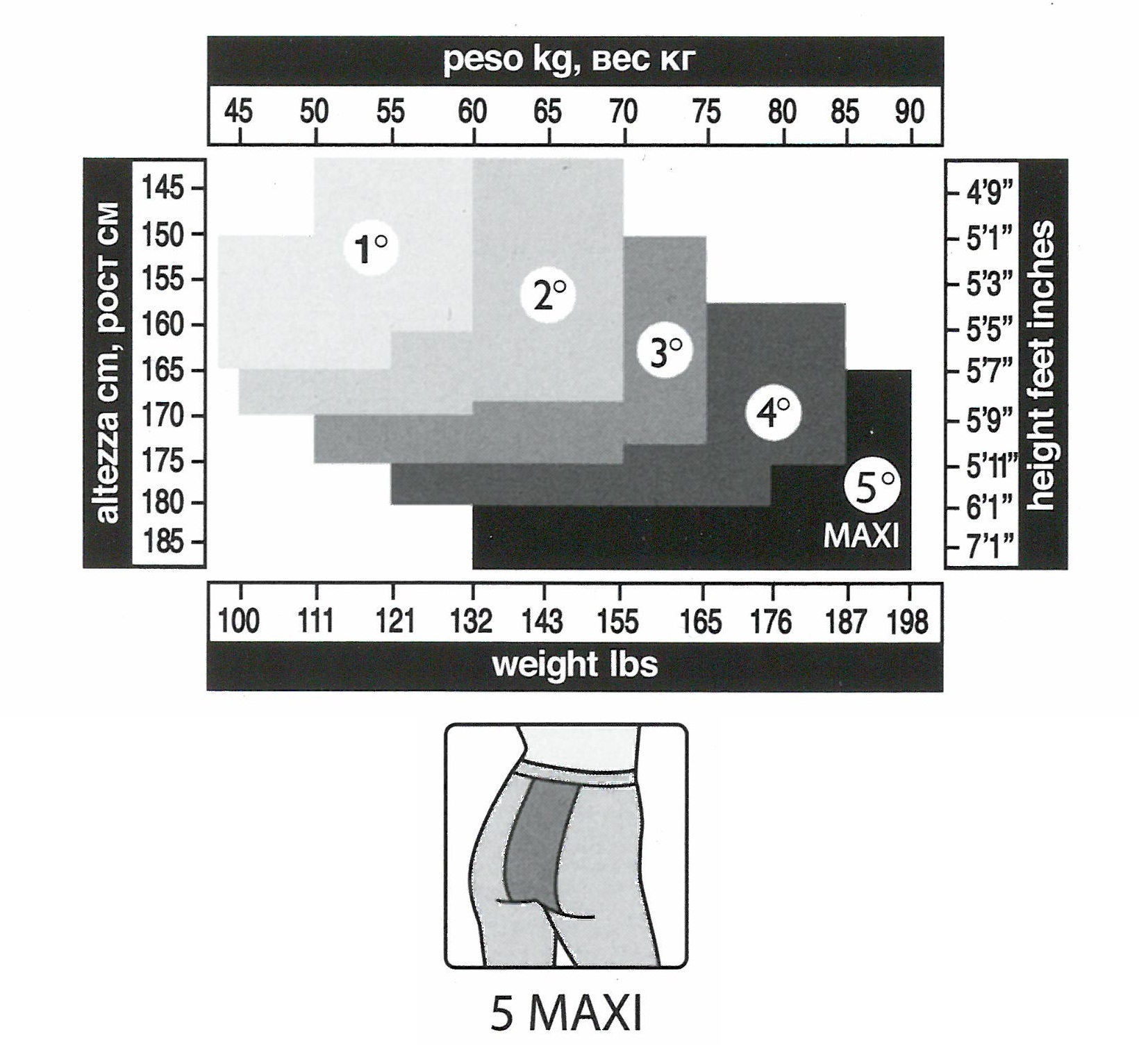 Scegliete la taglia controllando la tabella sulla confezione del collant. Le tabelle taglie si basano su peso e altezza, se siete indecise scegliete sempre la taglia in più, perché le collant corte inevitabilmente tendono a scendere.